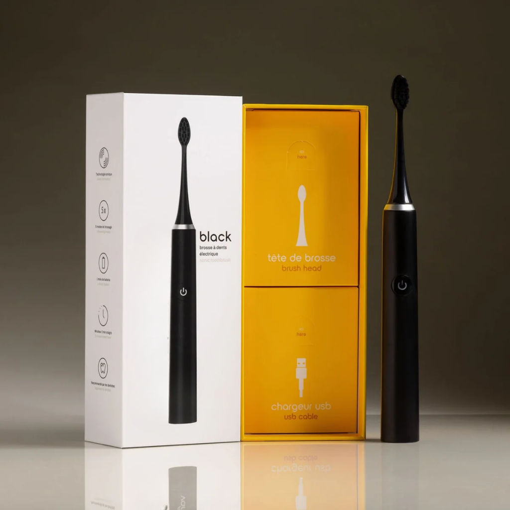 Une brosse à dents à puissance sonique + Une tête de brosse composée de poils souples + un capuchon de protection + un câble de charge USB-C